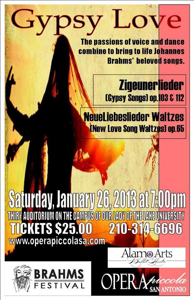 Opera Piccola of San Antonio and Alamo Arts Ballet Theatre performed a vocal/dance program titled Gypsy Love, featuring Johannes Brahms vocal masterpieces Zigeunerlieder and NeueLiebeslieder Waltzes, as part of the San Antonio Symphony's Brahms Festival. The performance was held at the Thiry Auditorium, on the campus of Our Lady of the Lake University.