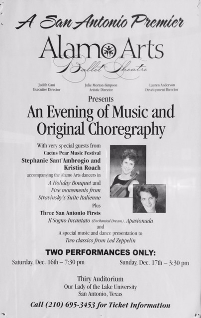 During this wonderful production, Alamo Arts Ballet Theatre collaborated with violinist, Stephanie Sant'Ambrogio and pianist Kristin Roach in Stravinsky's "Suite Italienne," and rock guitarist Jon Schmidt and drummer David Haddad in "A Little Bit of Zeppelin.". This performance marked the inaugural production of Alamo Arts Ballet Theatre.