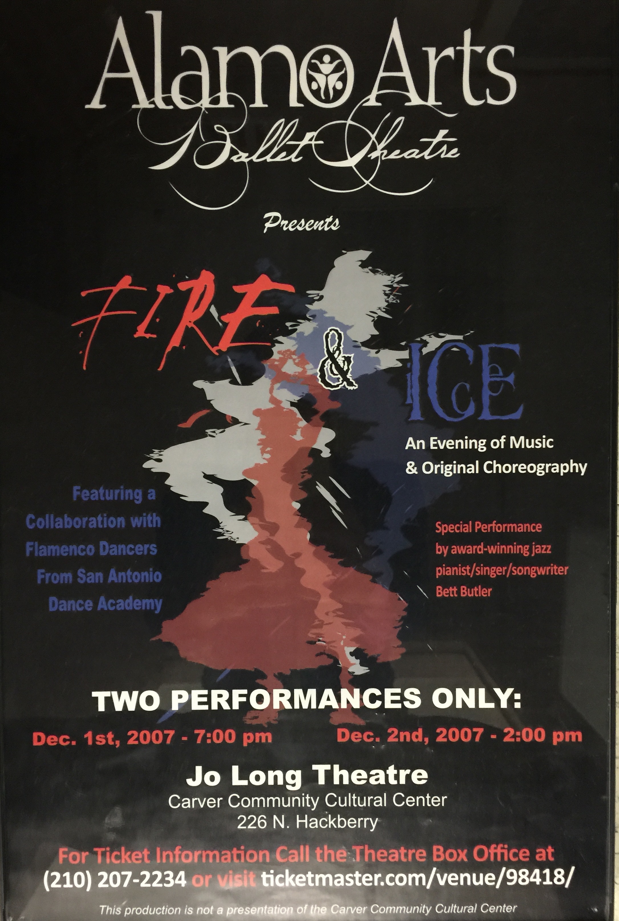 Fire & Ice consisted of collaboration between San Antonio Dance Academy flamenco dancers and Alamo Arts Ballet Theatre. The performance also featured a cameo appearance by award winning jazz pianist/singer/songwriter, Bett Butler. AABT contributed original ballet choreography by Julie Morton-Simpson, youth performance choreography by Judith Gani, and modern choreography by Meghan Oswald.