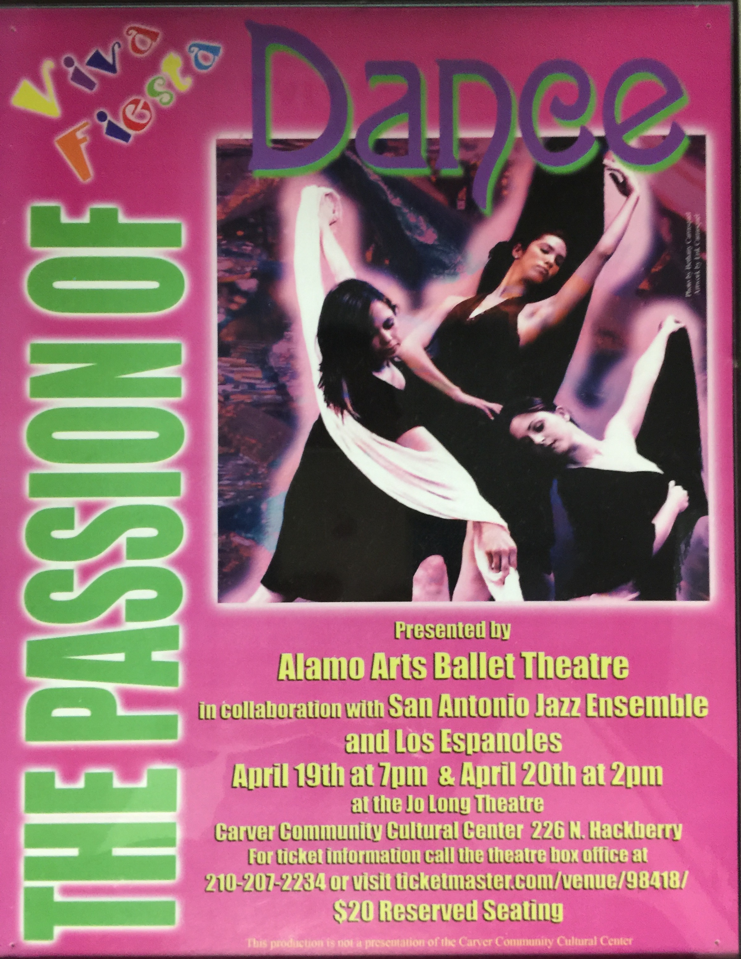 Viva Fiesta; The Passion of Dance consisted of a collaboration between AABT , the San Antonio Jazz Ensemble and Los Espanoles. Presented during this performance was original choreography by AABT Artisitc Director Julie Morton-Simpson, modern choreography by Britta Moe and Rhonda McClure and flamenco choreography by Josie Champion-Garcia.