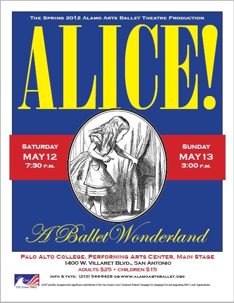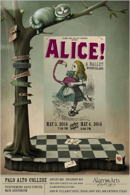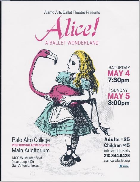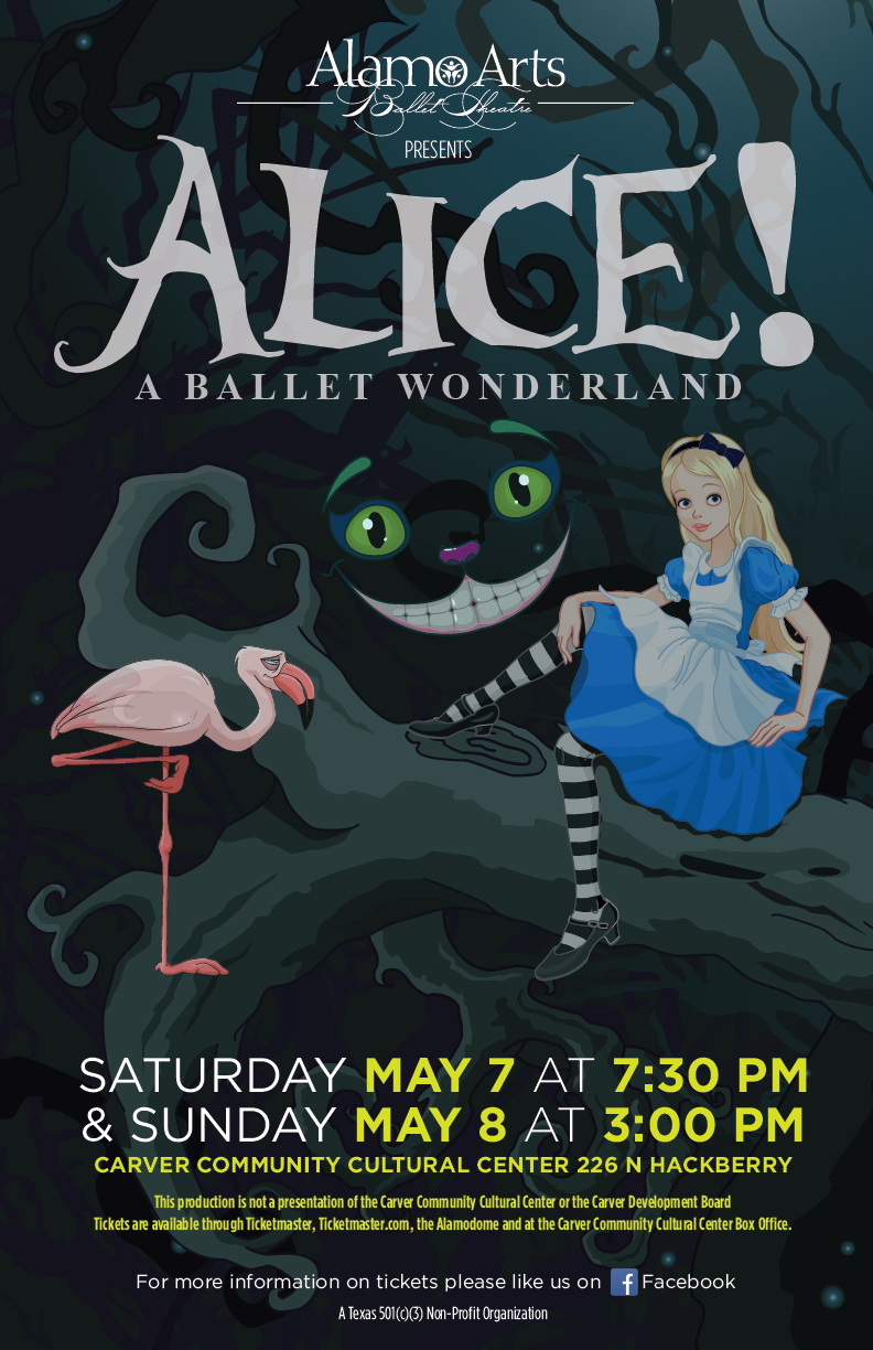 Alamo Arts Ballet Theatre presents its fourth annual production of Alice! A Ballet Wonderland May, 7th, 2016 at 7:30pm and May 8th, 2016 at 3:00pm at the Carver Community Cultural Center, 226 N. Hackberry. We would love for you to join us! Visit ticketmaster.com to purchase tickets!