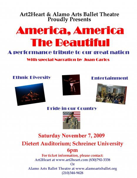 Alamo Arts Ballet Theatre joined Kerrville area non-profit organization, Art2Heart, in its presentation of America, America the Beautiful. This lively performance featured a patriotic theme and served as a tribute to our great nation. Alamo Arts Ballet Theatre was joined on stage by Art2Heart staff and youth.