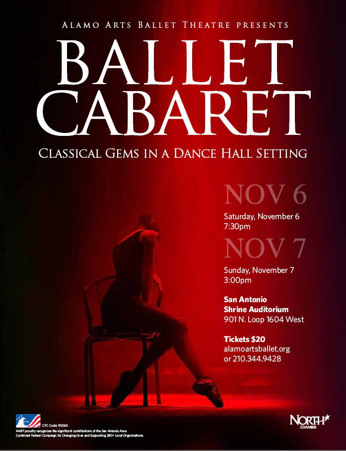 Alamo Arts Ballet Theatre presented Ballet Cabaret in the Fall of 2010. The performance included Pas de Quatre from the mid 1800’s; Shostakovich’s rarely heard Jazz Suite, from 1938, music by composer Leroy Anderson as well as choreography to music from the World War II era. The program included movie music ranging from Charlie Chaplain films, to Avatar. In addition, there were guest artists from Angel Santiago’s ballroom company who performed cutting edge tango pieces.