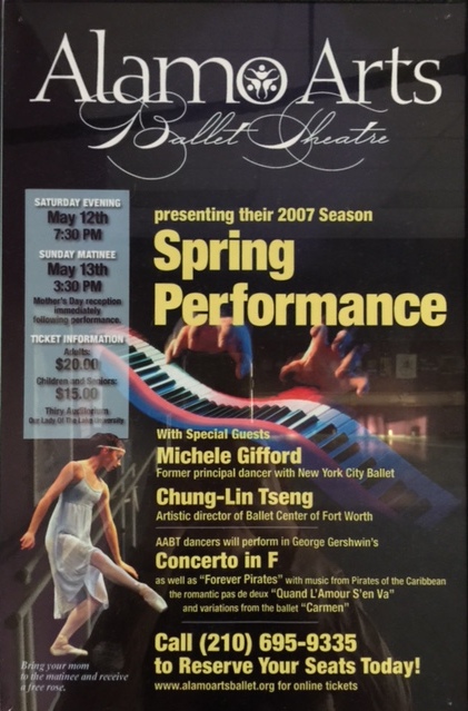 The Spring Performance marked the second successful production for Alamo Arts Ballet Theatre. By special arrangement with the Balanchine Trust, The Company featured New York City Ballet ballerina Michele Gifford in Balanchine's "Rubies pas de deux from Jewels.", Chung-Lin Tseng, Artistic Director of Ballet Center of Fort Worth, and original choreography by AABT Artistic Director, Julie Morton-Simpson-Excerpts from Carmen and Forever Pirates.
